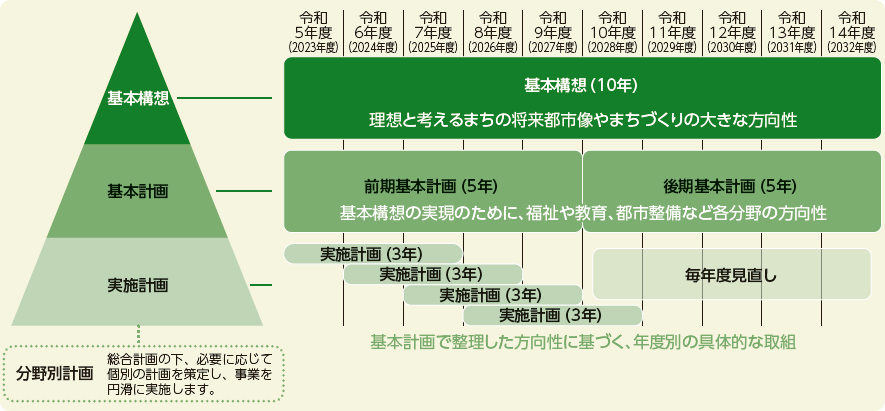 ▼総合計画 総合計画は、市政推進の最も基礎となる計画です。これからの新座市をどのようなまちにしていくか、というまちづくりの指針です。 基本構想、基本計画及び実施計画の3つで構成し、市が目指す将来都市像やまちづくりの方向性を総合的に定めています。 ▼第5次新座市総合計画の構成 ![]() ▼第5次新座市総合計画詳細(市のホームページへ) ◎基本構想・前期基本計画(デジタルブック版) ◎概要版(デジタルブック版) ◎基本構想・前期基本計画(PDF版) |
